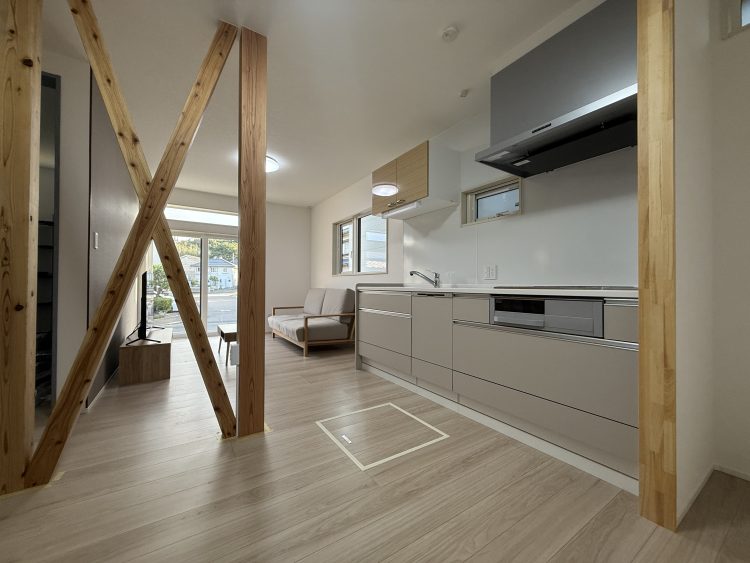 通常は壁の中に隠れてしまう筋交いをあえて、デザインとして見せることで仕切りを作らずに耐震性を確保。